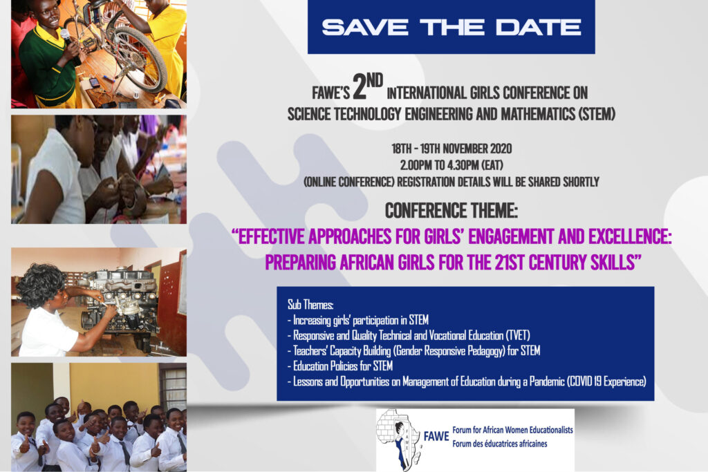Le FAWE a maintenant organisé les 2nd Thème de la conférence “Vers des approches efficaces pour l'engagement et l'excellence des filles : Préparer les filles africaines aux compétences du 21e siècle’. Cette conférence mettra l'accent sur les interventions du FAWE et d'autres partenaires dans le domaine des sciences, de la technologie, de l'ingénierie et des mathématiques (STEM) pour les filles en Afrique. La conférence devrait générer des connaissances pour une reproduction efficace et/ou une mise à l'échelle des interventions STEM réussies, une pédagogie sensible au genre pour les STEM, un enseignement technique et professionnel adapté et de qualité (TVET) et la promotion des politiques éducatives dans le domaine des STEM.